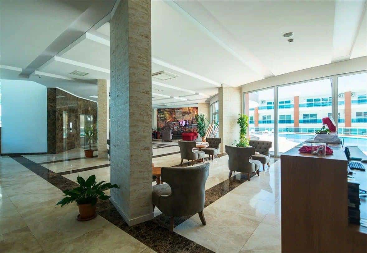 This luxury residence apartment Alanya comes fully furnished, making it ready for immediate use or rental income. The complex is known for its rich social facilities, including indoor and outdoor swimming pools, aqua park, sauna, Turkish bath, steam room, fitness center, cinema, and meeting rooms.