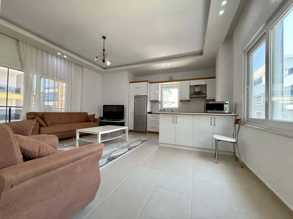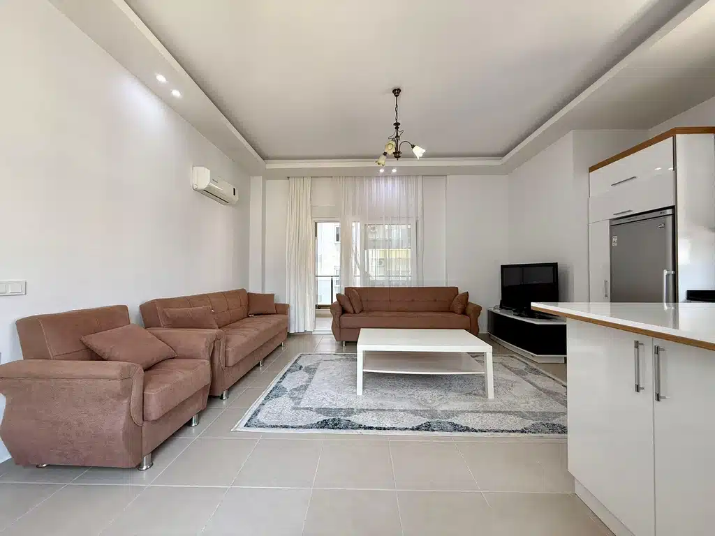 This Aral Residence apartment for sale is located directly on Barbaros Street, one of the most central and lively areas of Alanya. The 2+1 furnished apartment Alanya is situated on the 6th floor and offers 110 m² of spacious living area with a modern open-plan American kitchen.