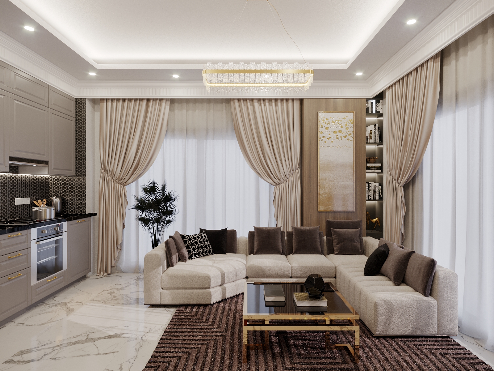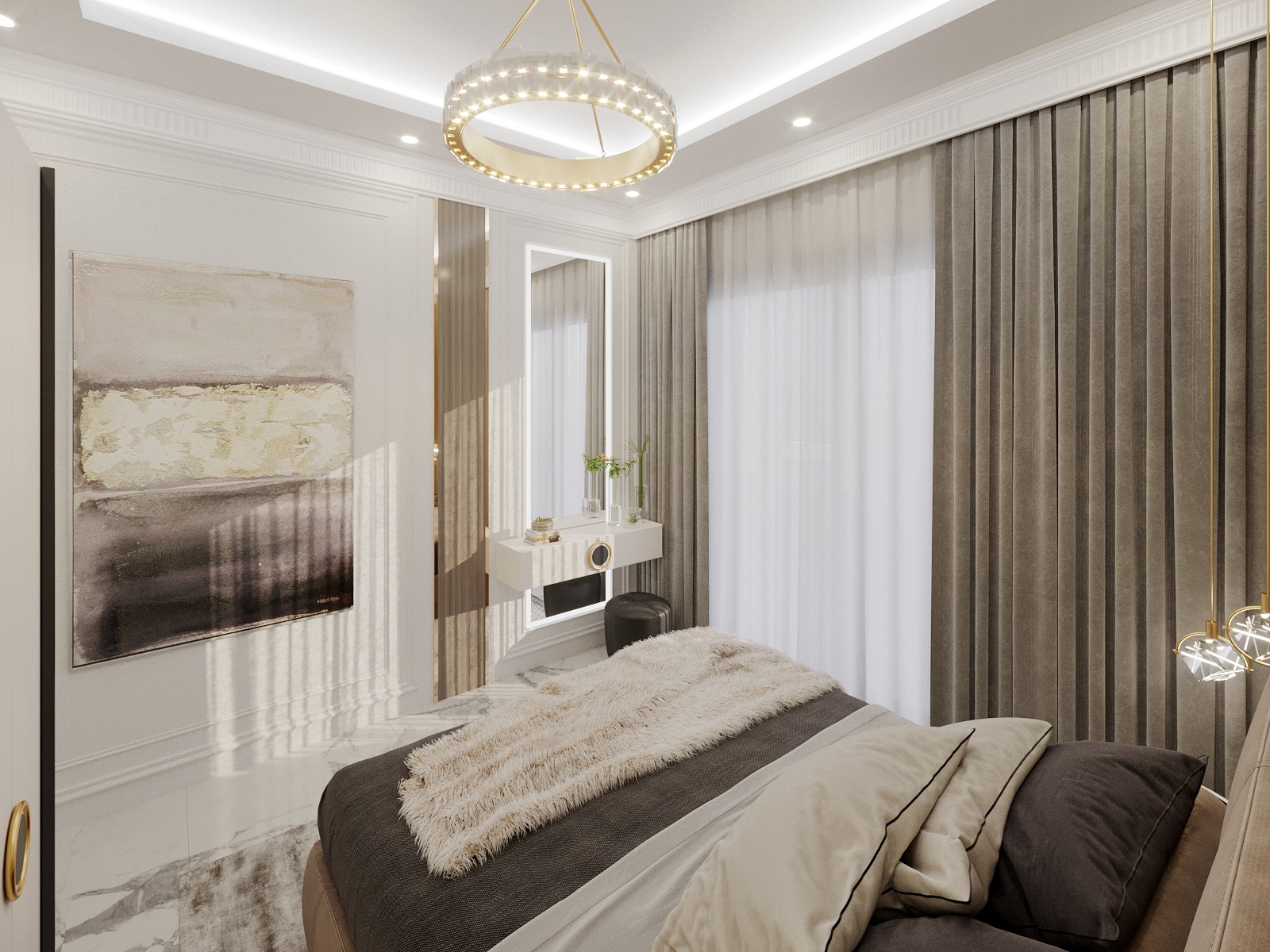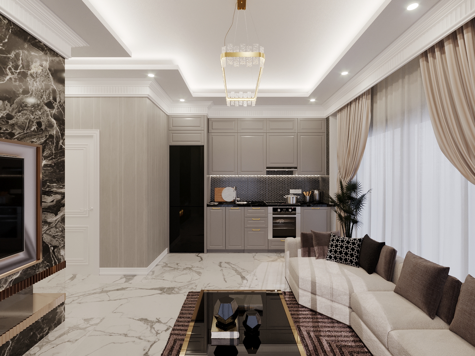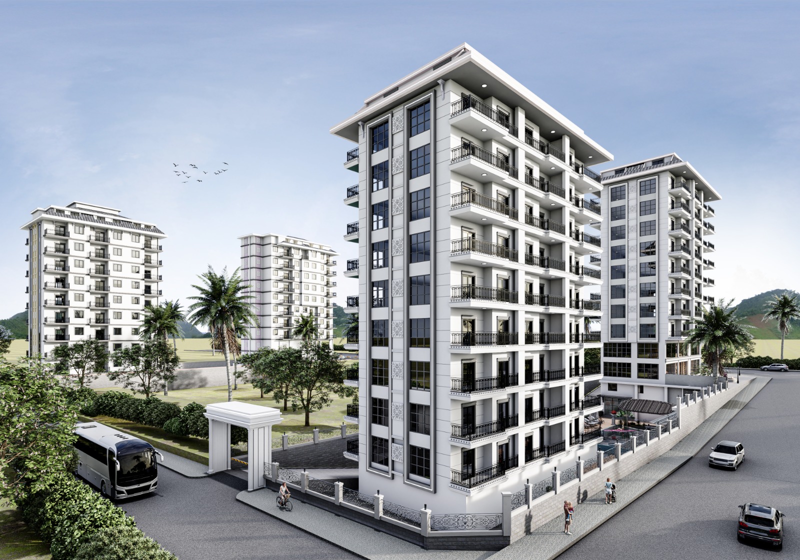 Особое внимание уделено качеству квартир: выполнена профессиональная шумоизоляция, установлены алюминиевые оконные рамы и полы из керамогранита (60×120). Кухни оснащены лакированными шкафами с гранитной столешницей. Наличие системы грубой очистки воды и круглосуточного видеонаблюдения делает эту недвижимость в Алании идеальным выбором для взыскательных покупателей.